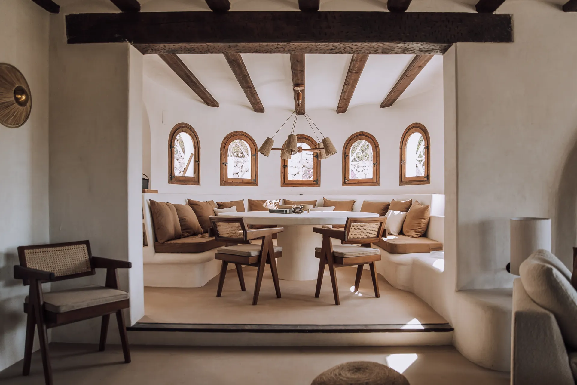Inspired by the serene geometry of Moroccan riads, its minimalist silhouette conceals an interior bathed in warmth and natural light. Stucco walls, soft earth tones, and fluid transitions between inside and out create an atmosphere both grounded and transcendent. Vast windows open to endless 360-degree views — landscapes that shift with every hour, every breath.